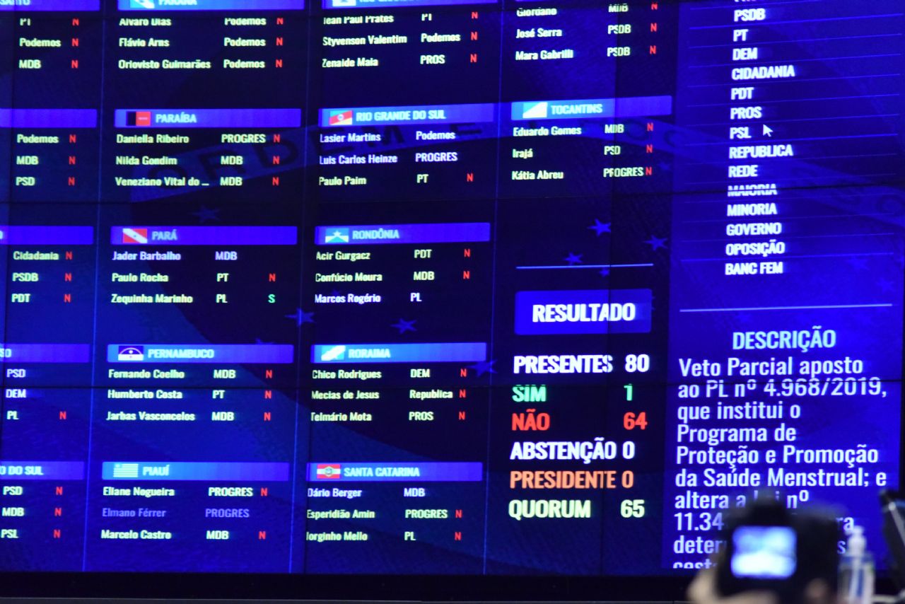O Congresso Nacional derrubou nesta quinta-feira (10) os vetos do presidente Jair Bolsonaro à lei que cria o Programa de Proteção e Promoção da Saúde Menstrual (Lei 14.214). A medida garante a distribuição gratuita de absorventes higiênicos para estudantes carentes dos ensinos fundamental e médio, mulheres em situação de vulnerabilidade e presidiárias.