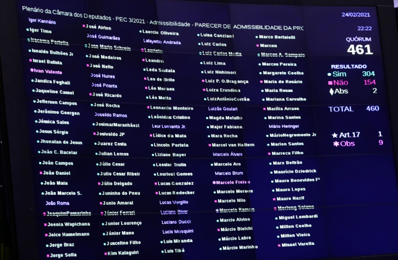 O Plenário aprovou nesta quarta-feira (24) a admissibilidade da Proposta de Emenda à Constituição 3/21, que regulamenta a imunidade parlamentar e ações contra autoridades. Com a votação favorável de 304 deputados contra 154 e duas abstenções, a votação da matéria em primeiro turno pode ocorrer nesta quinta (25).