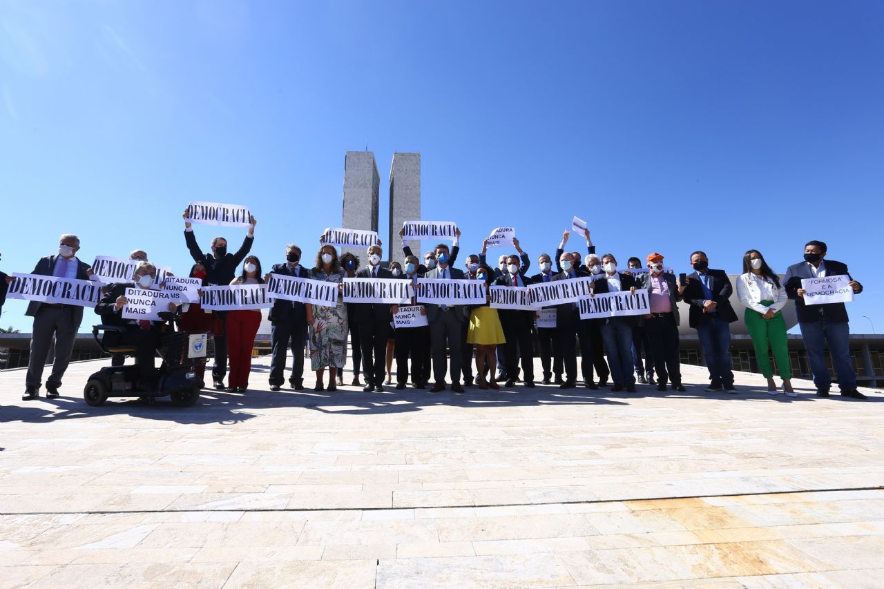 No dia que Bolsonaro leva tanques blindados para a Esplanada dos Ministérios, deputados de diferentes legendas realizam ato em defesa da democracia e reafirmam derrota do presidente sobre voto impresso.